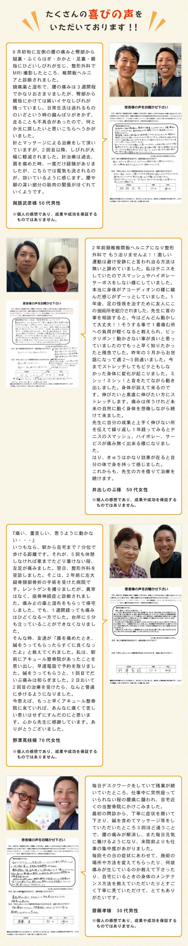ひとりでも多くの患者様の痛み、症状を取り除き、毎日苦しい日々から快適な毎日に過ごせるように日々努力をしております
