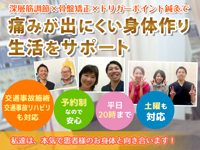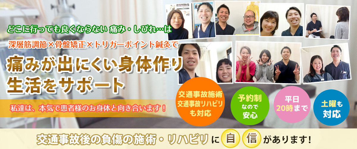 当院の治療は痛い箇所だけではなく、痛みを出す原因からも治療をし、再発しづらい体を作ります!むちうち・ケガ・リハビリ中の方でも安心です!